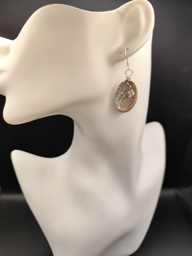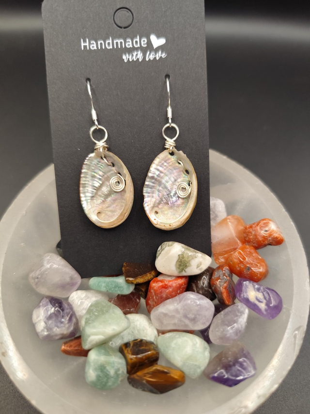Hand crafted wire wrapped Abalone earrings, with 925 silver hooks. Nice and shiny fronts and a natural (un polished) back of the shell. Lovingly made on board narrowboat Deltic.