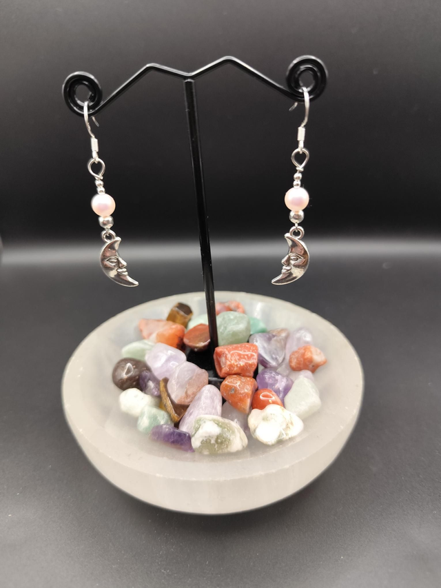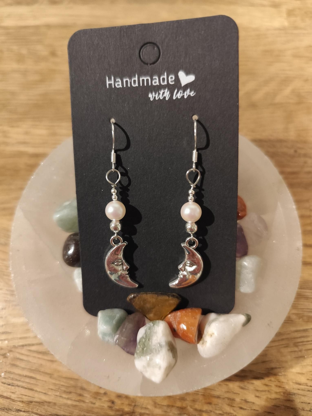 Hand crafted Freshwater Pearl & silvery moon earrings, with 925 silver hooks. Lovingly made on board narrowboat Deltic.