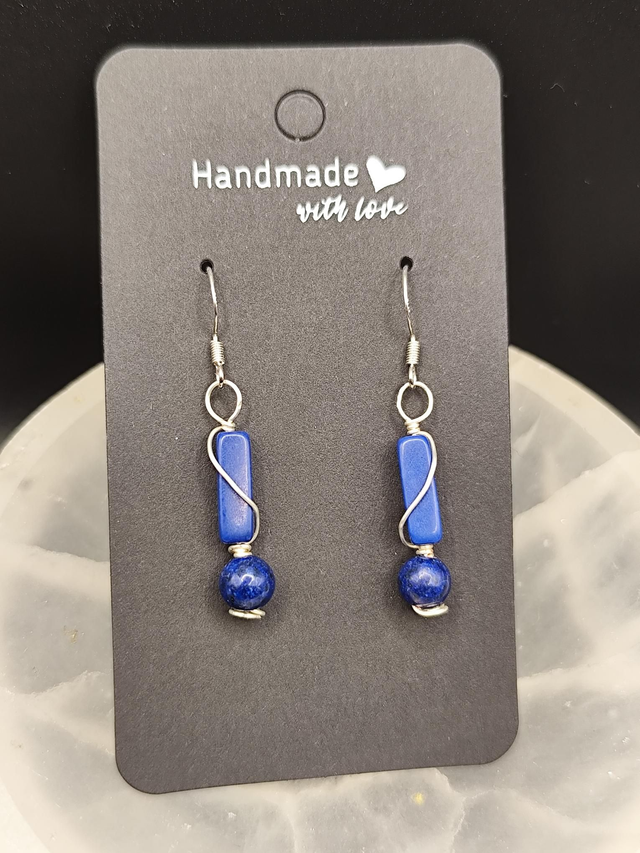 Hand crafted, wire wrapped Lapis Lazuli earrings, with 925 silver hooks. Lovingly made on board narrowboat Deltic.