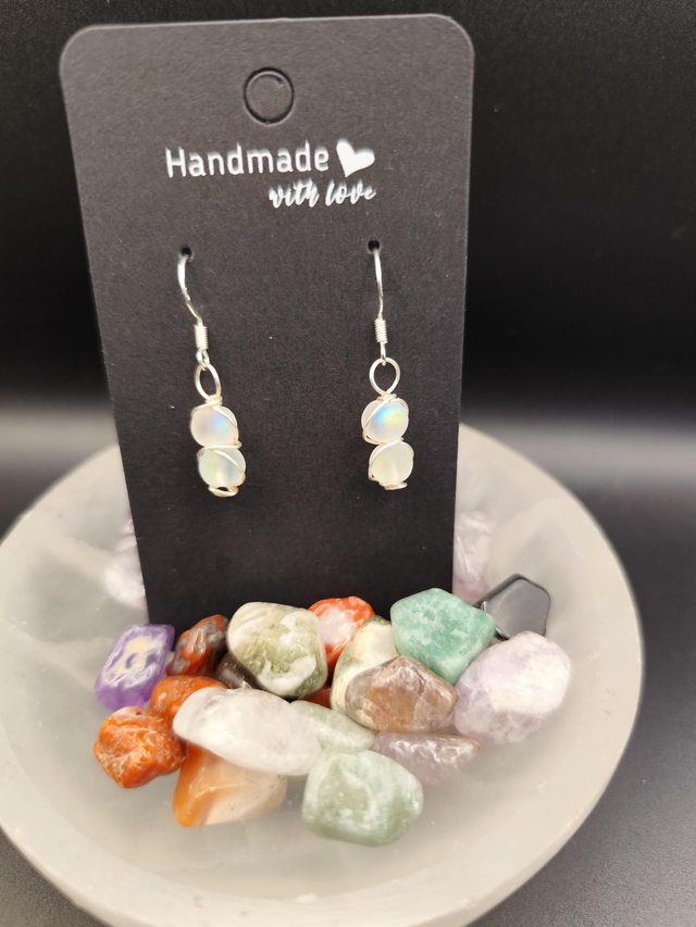 Hand crafted, wire wrapped Moonstone earrings, with 925 silver hooks. Lovingly made on board narrowboat Deltic.